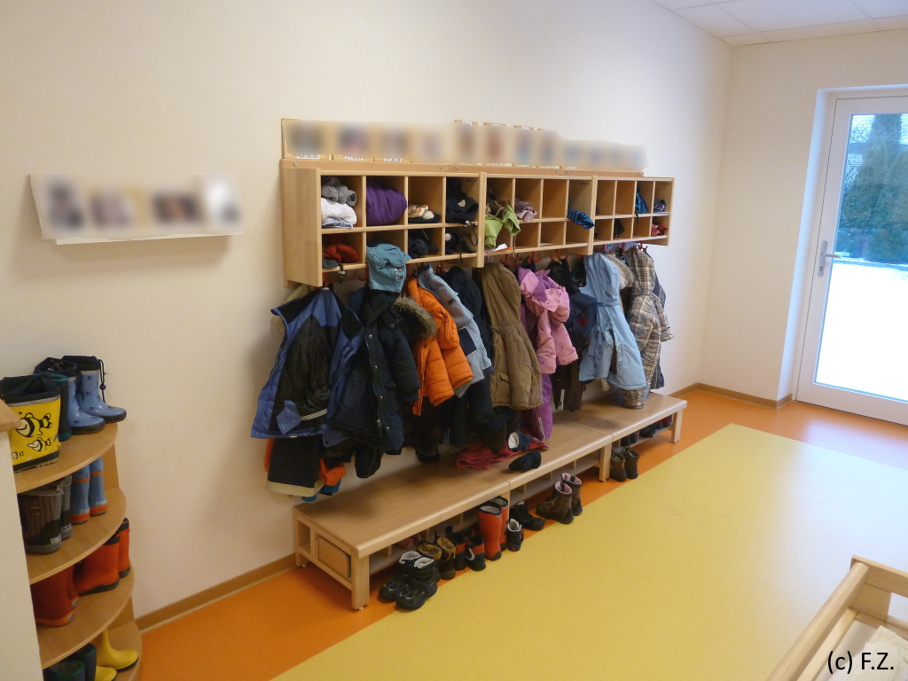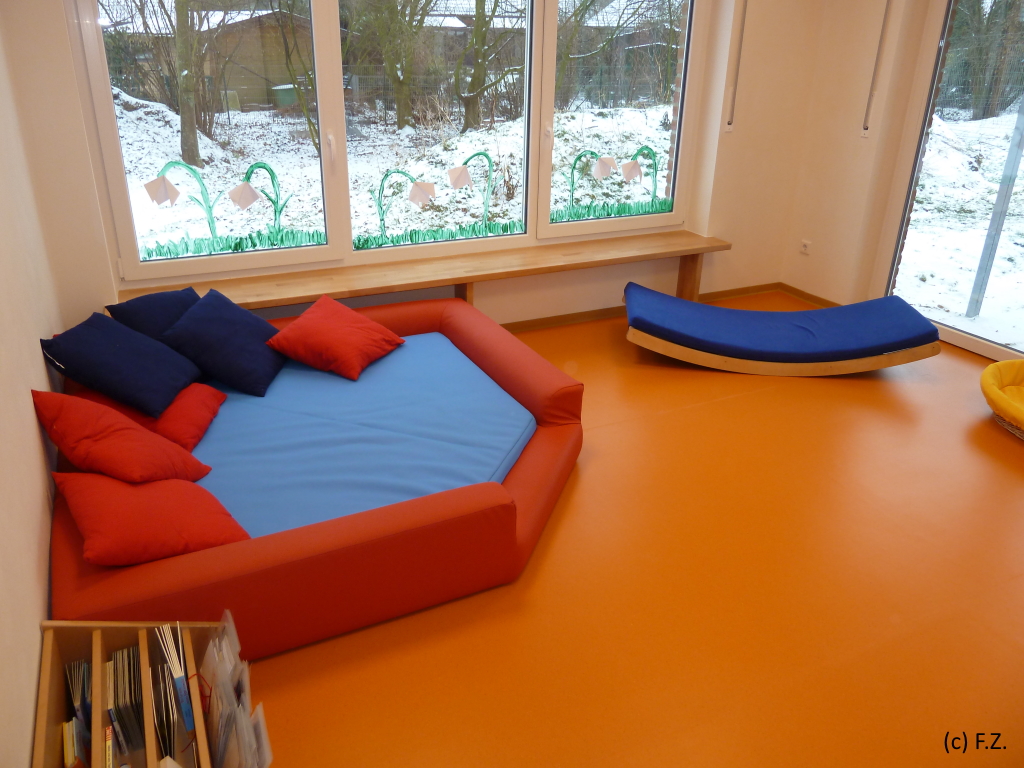 Die einzelnen Gruppenräume bestehen aus einem Haupt- und Nebenraum zum Spielen und Entspannen. Außerdem gehören jeweils kindgerechte Toiletten mit Waschbecken, ein Ausgang nach draußen und eine Garderobe dazu. Zusätzlich gibt es eine kleine Turn- und Bewegungshalle mit Spielgeräten.